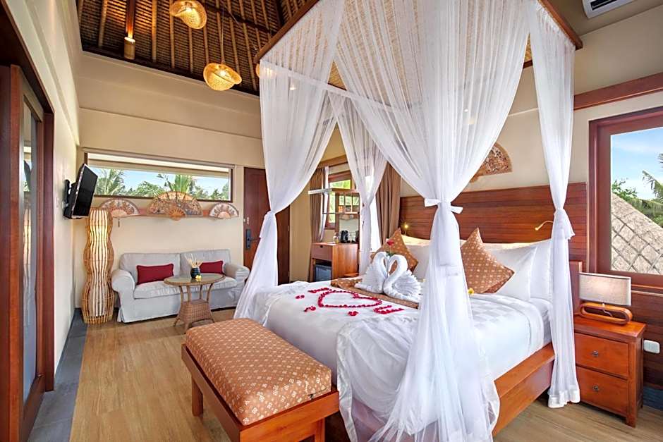 The room is including a honeymoon decoration on arrival, welcome drink served in your room, and daily afternoon tea & snack in our restaurant. Please enjoy the free daily resort activities such as daily scheduled shuttle service from resort to the Ubud town, a morning rice paddy walk, scheduled Authentic Balinese class, daily morning Hatta Yoga, scheduled wellness class such as sound healing, breathwork and body tone flow.