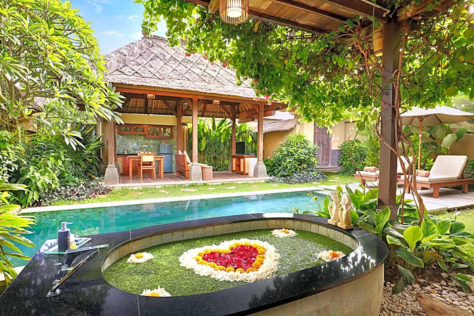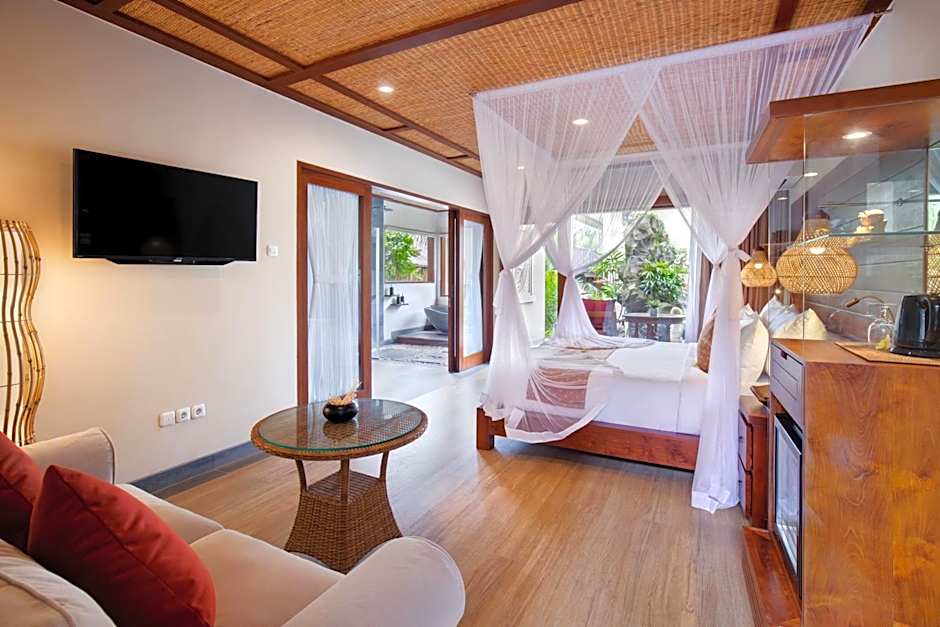 This 240-sqm villa features a private pool, a living room with a flat-screen TV and a kitchenette with coffee tea maker facility. The villa has an private bathroom with an inside natural stone bathtub, vanity unit, outdoor toilet, and outdoor Balinese shower. Enjoying the garden view from your bath will create a memorable bathing experience.