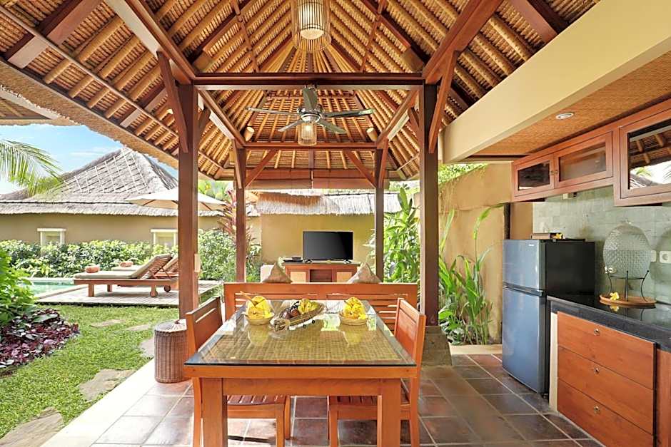This villa features a private pool, a living room with a flat-screen TV and a kitchenette with coffee tea maker facility. Ideal for large families and groups of friends looking for a luxurious getaway, these villas feature three luxurious bedrooms, three bathrooms, and larger swimming pool. Each room has an private bathroom with an inside natural stone bathtub, vanity unit, outdoor toilet, and outdoor Balinese shower.