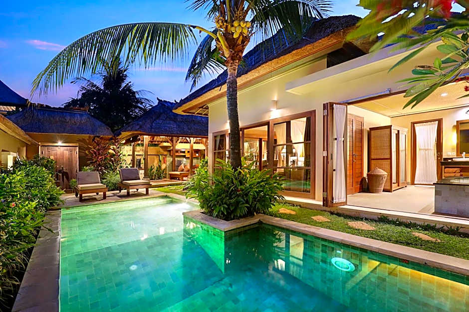 This 300-sqm villa features a private pool, a living room with a flat-screen TV and a kitchenette with coffee tea maker facility. Ideal for small families and groups of friends looking for a luxurious getaway, these villas feature two luxurious bedrooms, two bathrooms, and larger swimming pool. Each room has an private bathroom with an inside natural stone bathtub, vanity unit, outdoor toilet, and outdoor Balinese shower.